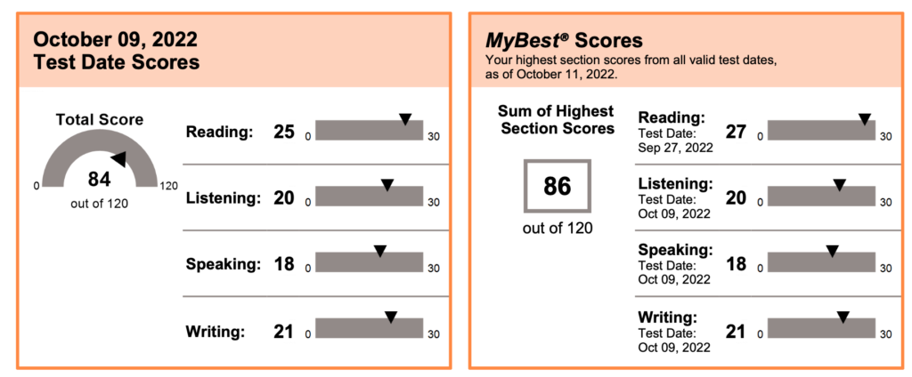 実際今見返せばそこまで高得点ではありませんが、当時の私は約4ヶ月ほど真剣に勉強しとったスコアだったので、かなり浮かれていました。(純ジャパでも凄い人は100点くらい取る)
